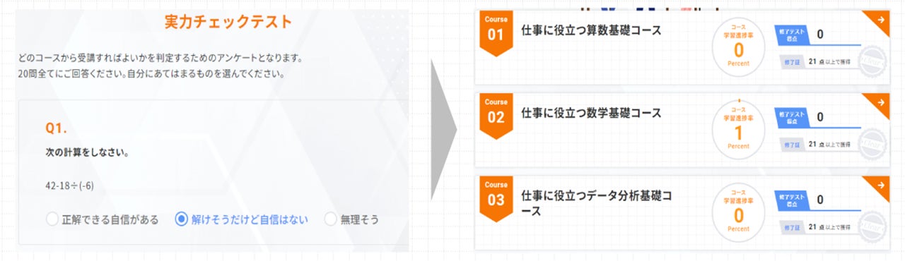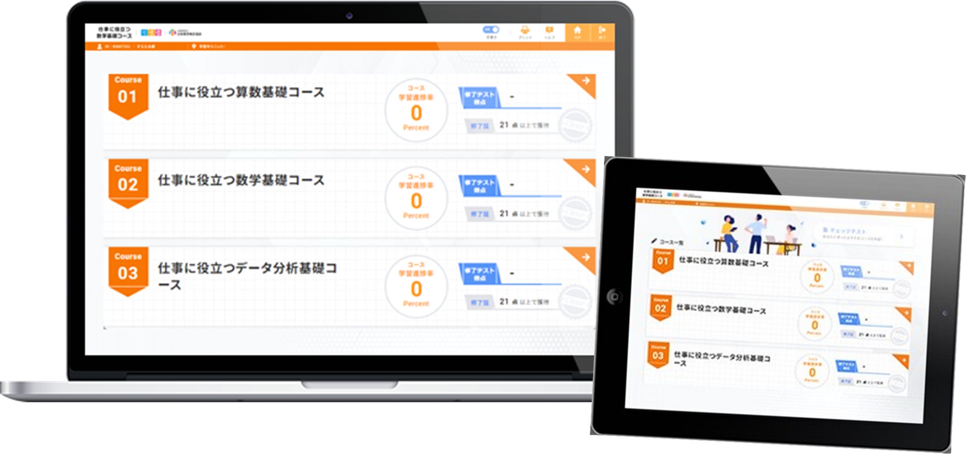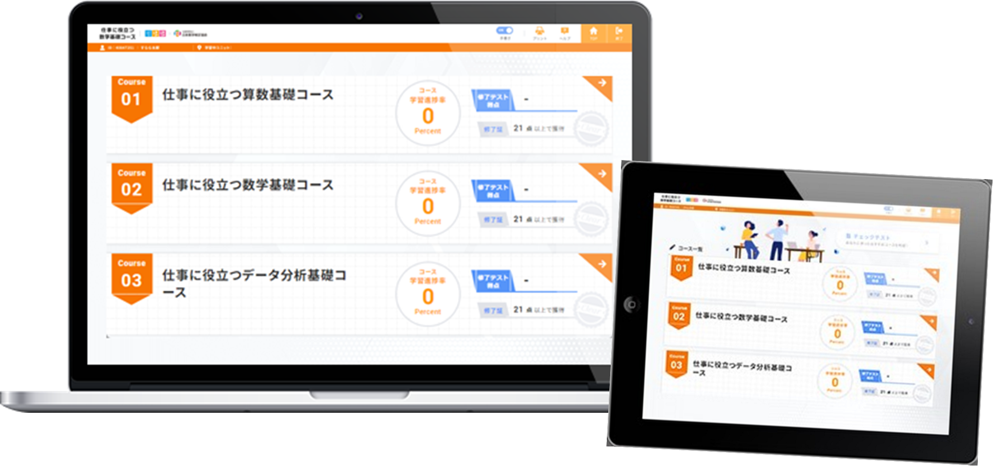 各コースの学習終了後に、公益財団法人日本数学検定協会が開発した「修了テスト」を設けています。コースの学習内容の定着度を把握することができるとともに、その活用能力は、「ビジネス数学検定」「データサイエンス数学ストラテジスト」を受検することで客観的に測定することもできます(※)。