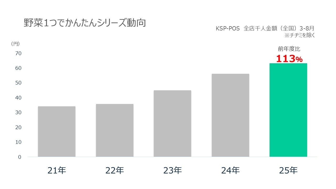 シリーズ動向としては、前年比113%と大きく伸長しており、その背景には「野菜1つですぐに作れる」「野菜がしっかり摂れる」「野菜が主役の大皿料理が完成する」といった簡便性や価値が、今の生活者ニーズに合致していると考えます。