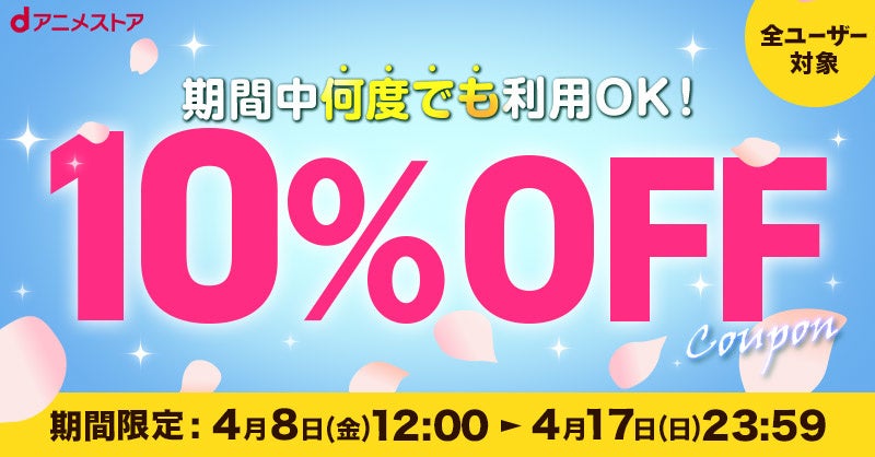 国内アニメ作品数No.1(※)見放題サイト「dアニメストア」( https://anime.dmkt-sp.jp/ )では、2022年4月8日~4月17日まで「【全ユーザー対象】10%OFFクーポン」を配布いたします。