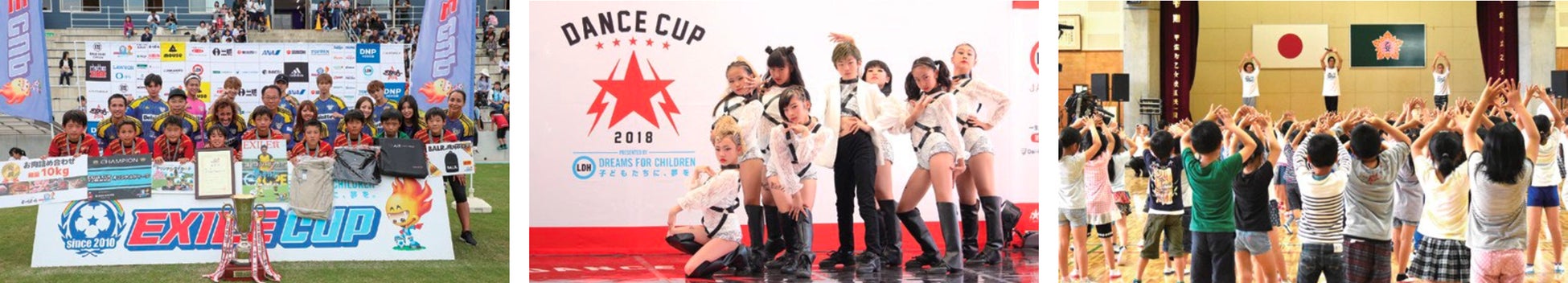 一方LDH JAPANは、“エンタテインメントだからこそできる社会貢献がある”という想いのもと、「Dreams For Children・子どもたちに、夢を。」をテーマに、日本、そして世界の未来を担う子どもたちに夢を持つことの素晴らしさを伝え、そしてその夢を応援する様々なプロジェクトを展開。2010年にスタートした小学校4年生から6年生を対象とするフットサル大会「EXILE CUP」では、参加費無料、決勝大会の旅費・交通費を事務局で補うことで、多くの子どもたちが「チャレンジ」できる機会を提供。これまでにのべ4,379チームが参加し、約38,396人の夢を持った子どもたちが熱い戦いを繰り広げました。その他にも全国のキッズダンサーの夢を応援し、活動の場を提供したいという想いで2014年よりスタートしたストリートダンスコンテスト「DANCE CUP」や、各界で活躍する人物を小・中学校に招き、共同で何かを創り上げるプロジェクト「夢の課外授業」をはじめ、所属アーティスト、タレント、スタッフ、LDH JAPAN全体で様々な社会貢献活動に取り組んでいます。