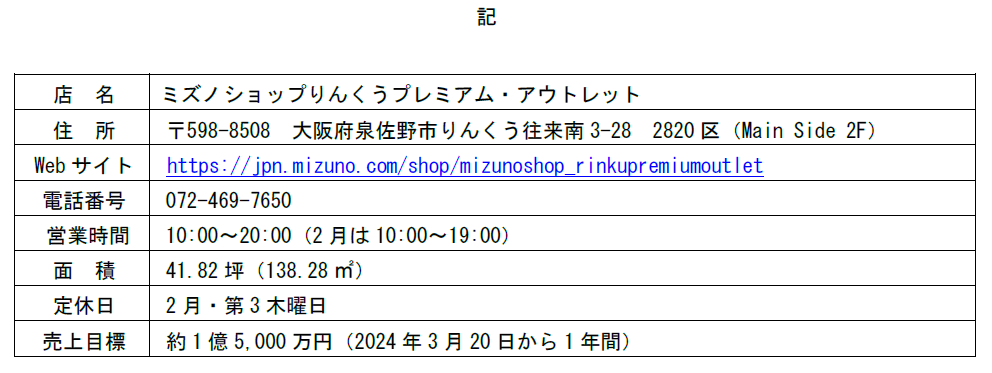 「ミズノショップりんくうプレミアム・アウトレット」オープン