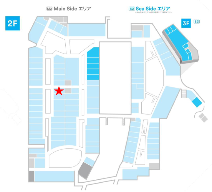 りんくうプレミアム・アウトレット内のMain Side(メインサイド)エリア2階、下図の★が「ミズノショップりんくうプレミアム・アウトレット」です。