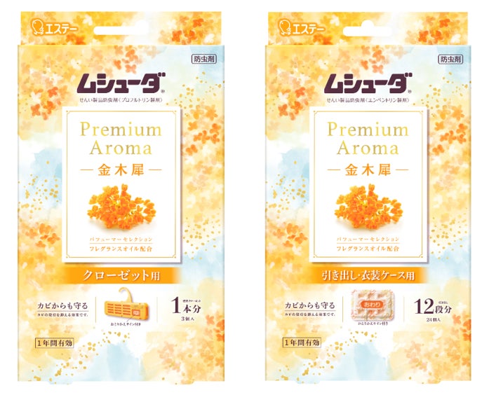 エステー株式会社は、パフューマーが厳選したフレグランスオイルを配合した防虫剤「ムシューダ Premium Aroma」シリーズに上質で可憐な〈金木犀〉の香りの「ムシューダ Premium Aroma クローゼット用」と「ムシューダ Premium Aroma 引き出し・衣装ケース用」を新たにラインナップし、8月12日から全国のスーパー、ドラッグストア、ホームセンター、ネットショップなどで新発売します。価格はオープンですが、店頭での実勢価格は「クローゼット用」が税込み1,042円前後、「引き出し・衣装ケース用」が同932円前後の見込みです。