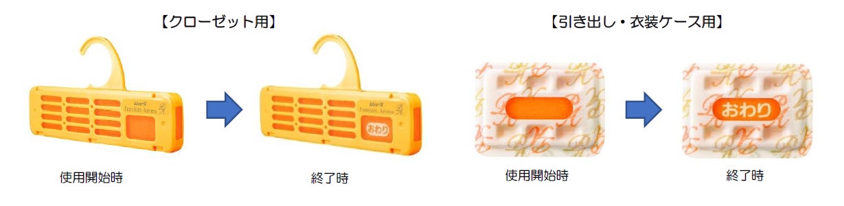 「クローゼット用」は、標準クローゼット1本分の空間に対応する3個入り、「引き出し・衣装ケース用」は12段分の24個入りとなっています。どちらも取り替え時期がわかる“おとりかえサイン(下図)”付きです。