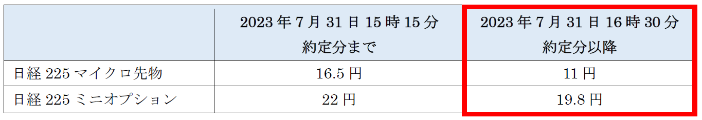 楽天証券では、2023年7月31日(月)16時30分(夜間立会の約定分)より、両銘柄の取引手数料を1枚あたり、「日経225マイクロ先物」を16.5円(税込)から11円(税込)に、「日経225ミニオプション」を22円(税込)から19.8円(税込)に、それぞれ業界最低水準※に改定します。これにより、これまで以上に低コストで両銘柄への投資をしていただける環境が整います。