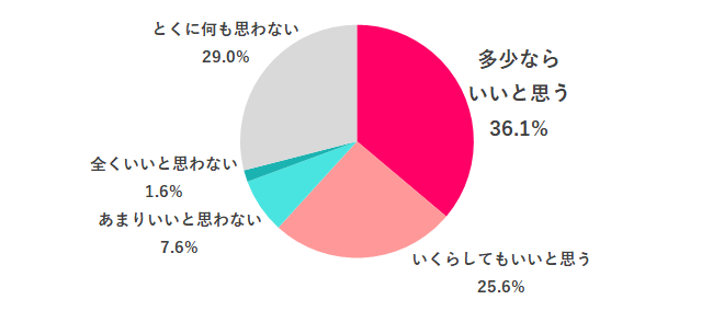 男性が職場でメイクをすることについてどう思うかを尋ねると、「多少ならいいと思う」が最も多く36.1%でした。「いくらしてもいいと思う」25.6%を含めると、肯定派は約6割です。逆に「あまりいいと思わない」「全くいいと思わない」の否定派は1割程度でした。「とくに何も思わない」を含めると、大多数の女性が男性の職場でのメイクについて大きなネガティブはない状況が見て取れました。