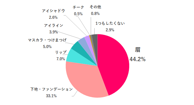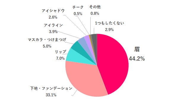 オフィス(職場)でメイクを1箇所しかできないなら何をするかを尋ねると、1位「眉」44.2%、2位「下地・ファンデーション」33.1%、3位「リップ」7.0%と続きました。