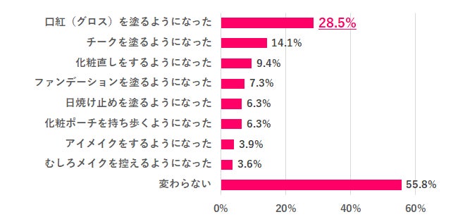 マスクが個人の判断になったことで、通勤時のメイクの仕方についても変化を尋ねたところ、「変わらない」が55.8%と最多でした。一方、「口紅(グロス)を塗るようになった」28.5%、「チークを塗るようになった」14.1%など、マスクを外す機会が増えたことでメイクの仕方に変化が見られる人もいました。