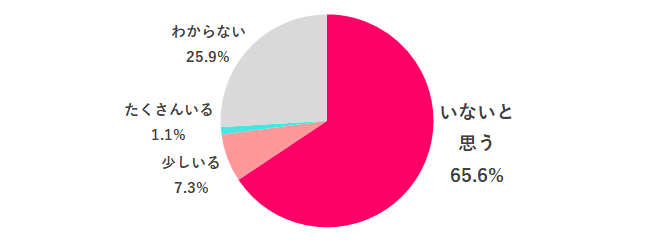 職場に男性でメイクをしている人がいるかどうか尋ねると、「いないと思う」が最も多く65.6%でした。「少しいる」7.3%、「たくさんいる」1.1%、と「いる」と答えた人は1割以下でした。