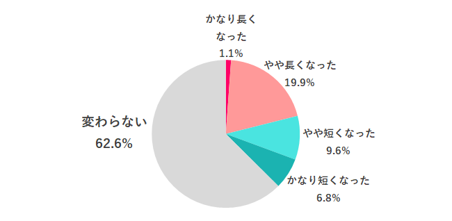 女の転職type会員に、マスクが個人の判断になったことで通勤時のメイク時間が変わったかどうか尋ねたところ、「変わらない」が最も多く62.6%でした。次に多かったのは「やや長くなった」19.9%で「かなり長くなった」1.1%を含めると約2割の人が長くなったと答えています。逆に「やや短くなった」「かなり短くなった」は合計すると15%ほどでした。
