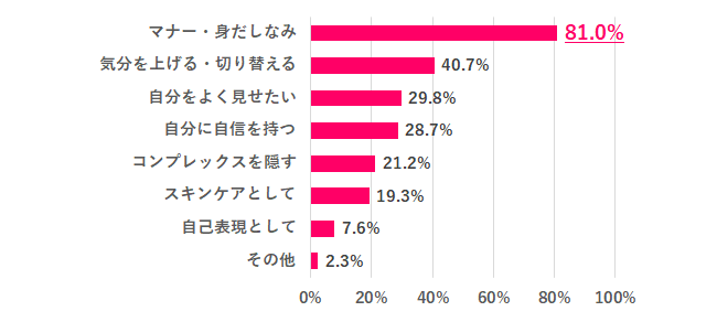 オフィス(職場)でメイクをする理由について尋ねると、1位「マナー・身だしなみ」81.0%、2位「気分を上げる・切り替える」40.7%、3位「自分をよく見せたい」29.8%と続きました。