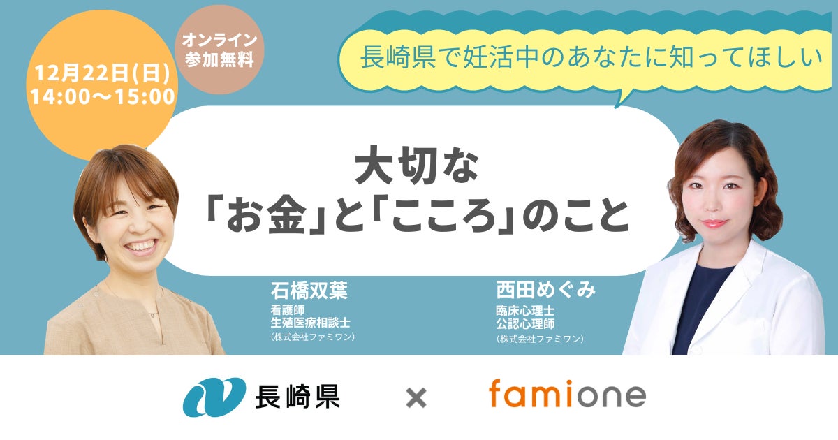 「子どもを願うすべての人によりそい 幸せな人生を歩める社会をつくる」をビジョンに掲げ、法人の従業員向け福利厚生や自治体の住民向け支援を行うヘルスケアサポートサービス「ファミワン」 https://famione.com/benefit/ などを展開する株式会社ファミワン(本社:東京都渋谷区、代表取締役:石川勇介)は、長崎県(知事:大石賢吾)からの委託を受け行なっている「妊活LINEサポート事業」の一環として、オンラインセミナー「長崎県で妊活中のあなたに知ってほしい 大切な「お金」と「こころ」のこと」を2024年12月22日(日)に開催します。