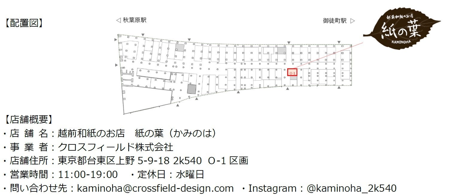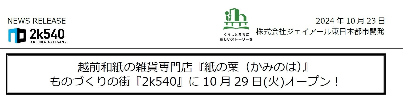 JR秋葉原駅と御徒町駅間の鉄道高架下に位置する、“日本のものづくり”をテーマにした商業施設『2k540 AKI-OKA ARTISAN(ニーケーゴーヨンマル アキオカ アルチザン)』にて、越前和紙の雑貨専門店『紙の葉(かみのは』が2024年10月29日(火)11時にグランドオープンいたします。