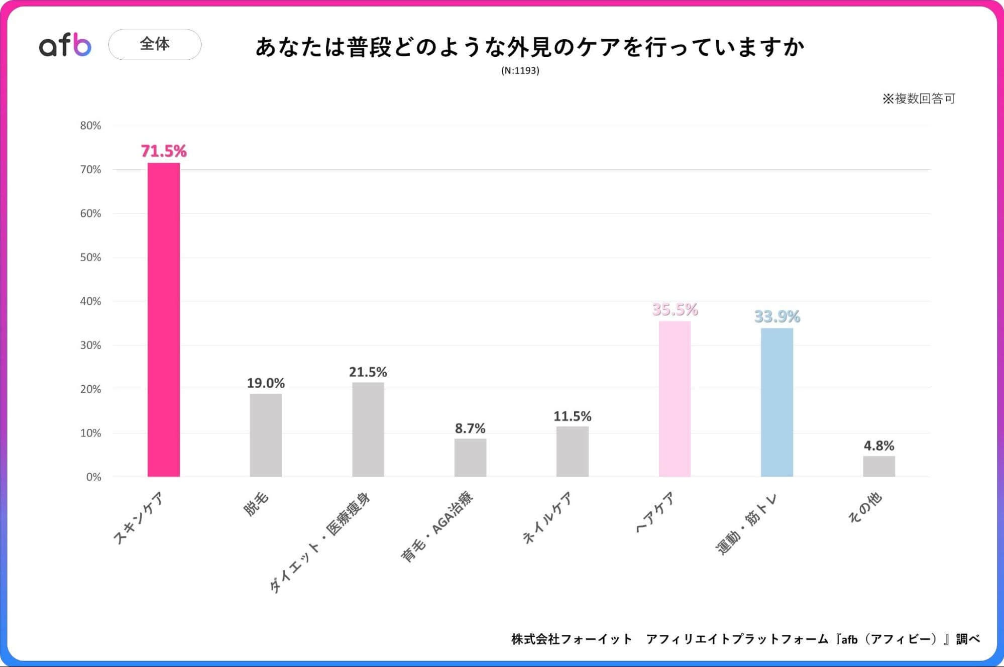 アフィリエイトプラットフォーム「afb(アフィビー)」< https://www.afi-b.com/ >の開発運用をおこなう株式会社フォーイットは、全国の20代~60代までの男女1,193人を対象に身だしなみに関するアンケートを実施し、年代別等の特徴についてまとめました。
