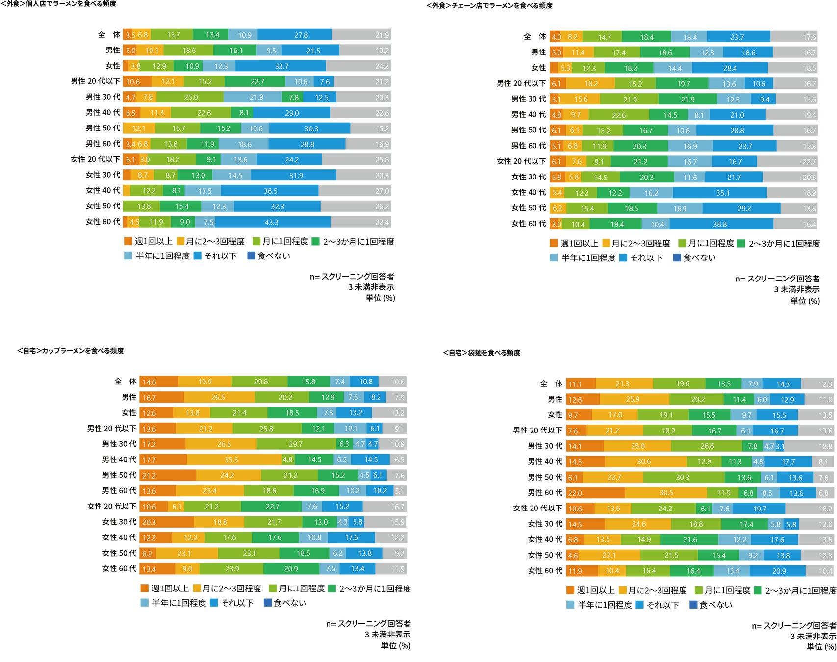 SC4.あなたは普段、「ラーメン」をどのくらいの頻度で召し上がっていますか。それぞれの場面について、召し上がる頻度をお知らせください。(それぞれ1つずつ選択)
