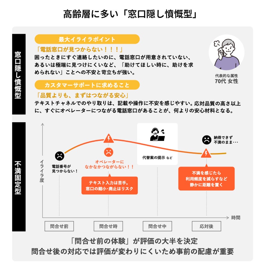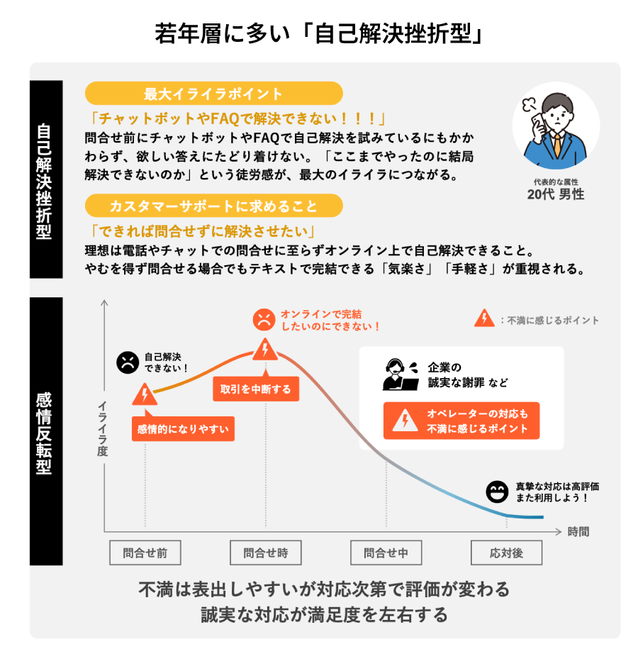 カスタマーサポート利用時の不満は一様ではなく、問合せ前の体験を起点とした不満の生まれ方には、属性や行動特性による傾向差がありました。その中でも、若年層に多い「自己解決を試みたものの解決できずに不満が高まる『自己解決挫折型』」と、高齢層に多い「問合せ先が見つからないこと自体に強い不満を感じる『窓口隠し憤慨型』といった対照的なケースが確認され、不満の生じ方や、その後の評価回復のしやすさに違いが見られました。