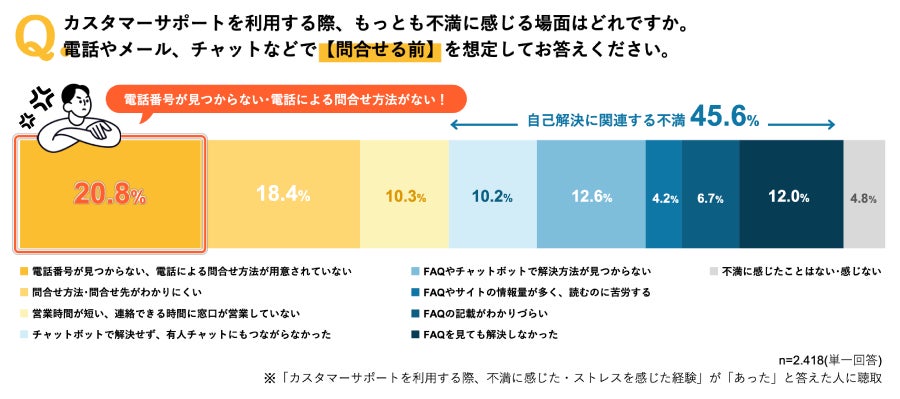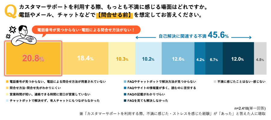 不満を感じる場面として多かったのは、オペレーターの応対そのものではなく、問合せ前〜サポート接続前の体験でした。「電話番号が見つからない」「FAQやチャットボットで解決方法が見つからない」など、問合せ導線や自己解決環境への不満が、イライラの主因となっていることが明らかになりました。