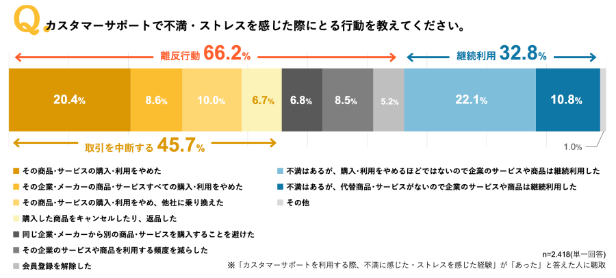 カスタマーサポート利用時に不満・ストレスを感じた経験がある人は、80.6%にのぼりました。そのうち、73.7%は不満を複数回経験しており、不満が一度きりではなく、繰り返し生じている傾向がうかがえます。また、不満を感じた際の行動では、「利用停止」「乗り換え」「利用縮小」などの離反行動が66.2%を占め、継続利用は32.8%にとどまっています。サポート体験が、顧客の継続利用や離脱へ直結している実態が明らかになりました。
