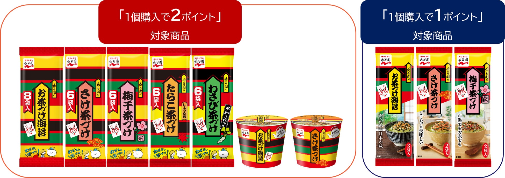 ※お茶づけ海苔3袋入、さけ茶づけ2袋入、梅干茶づけ2袋入は1個購入で1ポイント獲得