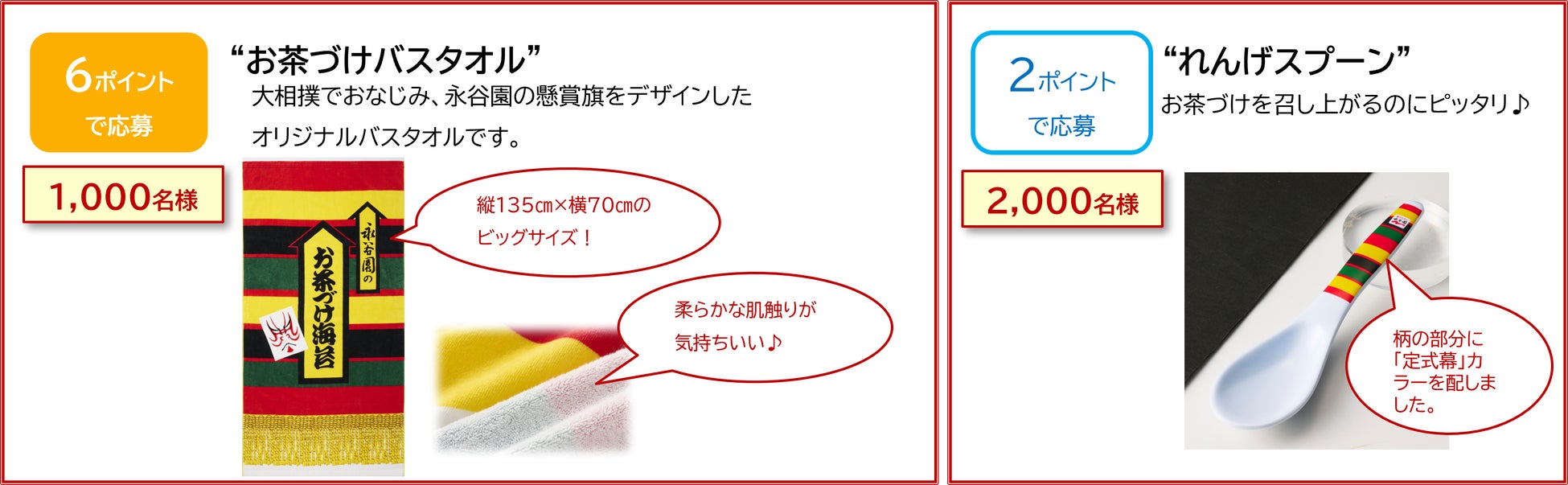 株式会社 永谷園(社長:掛谷 浩志、東京都港区)は、弊社お茶づけ商品の購入レシートでポイントを貯めて、ご応募いただく「食べて貯めて当たる 衣食住グッズキャンペーン(当選者 合計3,500名様)」を2025年10月1日(水)より実施いたします。