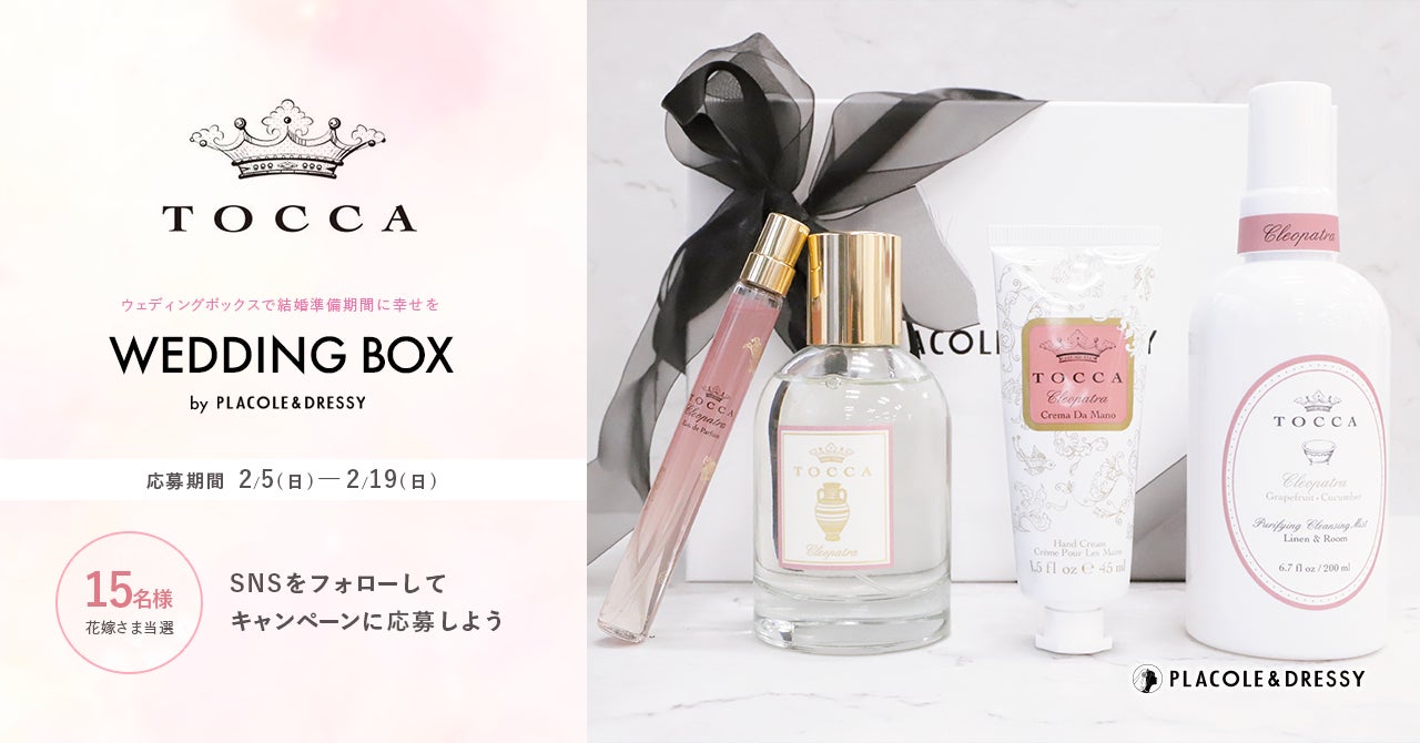 「PLACOLE & DRESSY」ブランドを展開する、冒険社プラコレ(本社:神奈川県鎌倉市、代表取締役CEO:武藤功樹)は、花嫁の結婚準備期間に幸せを届ける Wedding Box -ウェディングボックス-を制作、この季節にぴったりのアイテムを集めたTOCCABeautyのボックスを15名へのプレゼントすることを決定致しました。