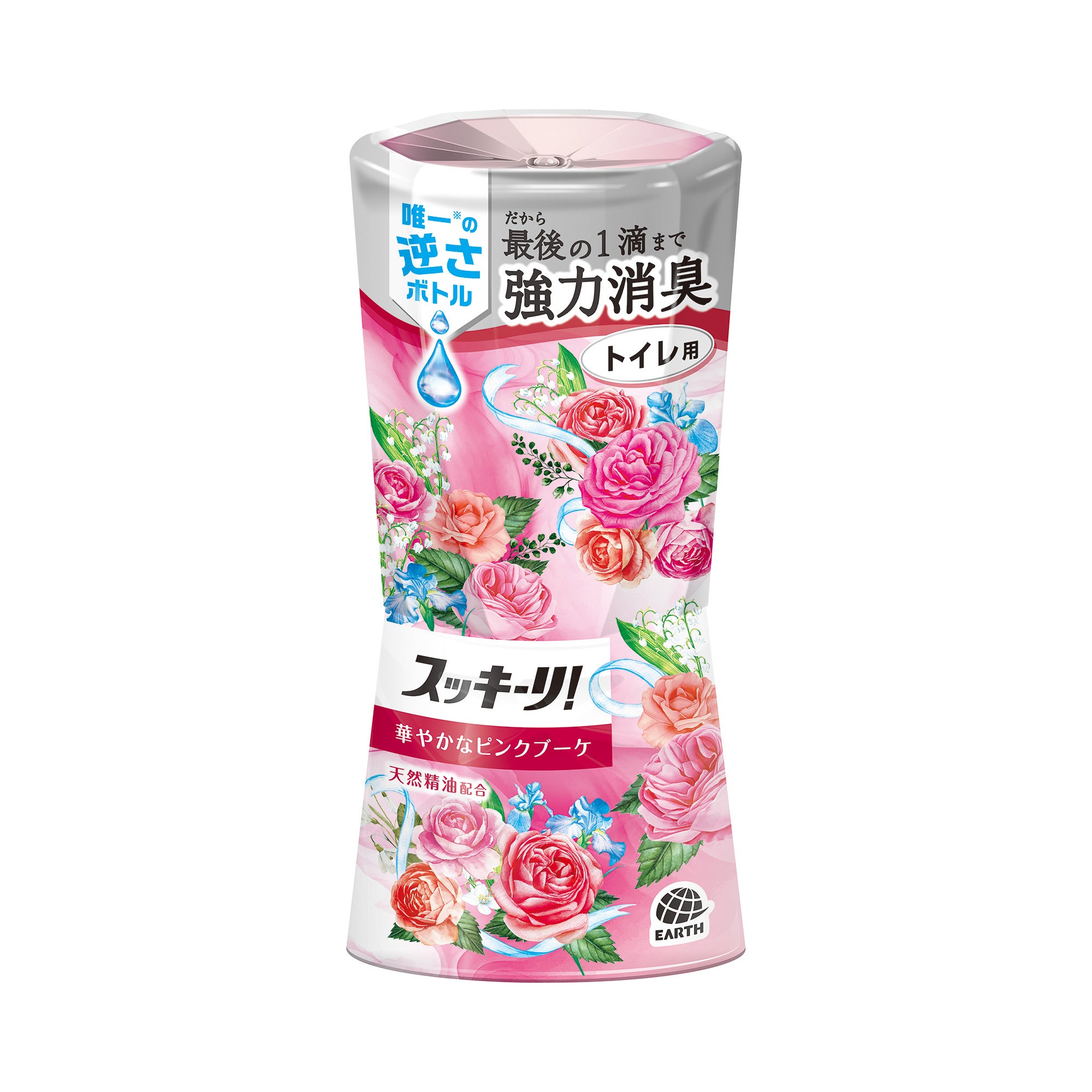 『スッキーリ!』は、独自の「逆さボトル」を採用した消臭芳香剤ブランドです。重力で消臭芳香液が上から下へと落ちるため、液残りせず、最後の1滴まで消臭効果と香りが続きます。また、『スッキーリ!』ブランドのスプレータイプである『スッキーリエア!』は、パワー噴射でトイレのイヤなニオイを瞬時に消臭し、さわやかな香りを広げます。さらに、除菌成分イソプロピルメチルフェノール(IPMP)配合で、便器内の除菌も可能です※1。2016年の発売以降、その効果の持続性で多くのお客様からご好評をいただいています。