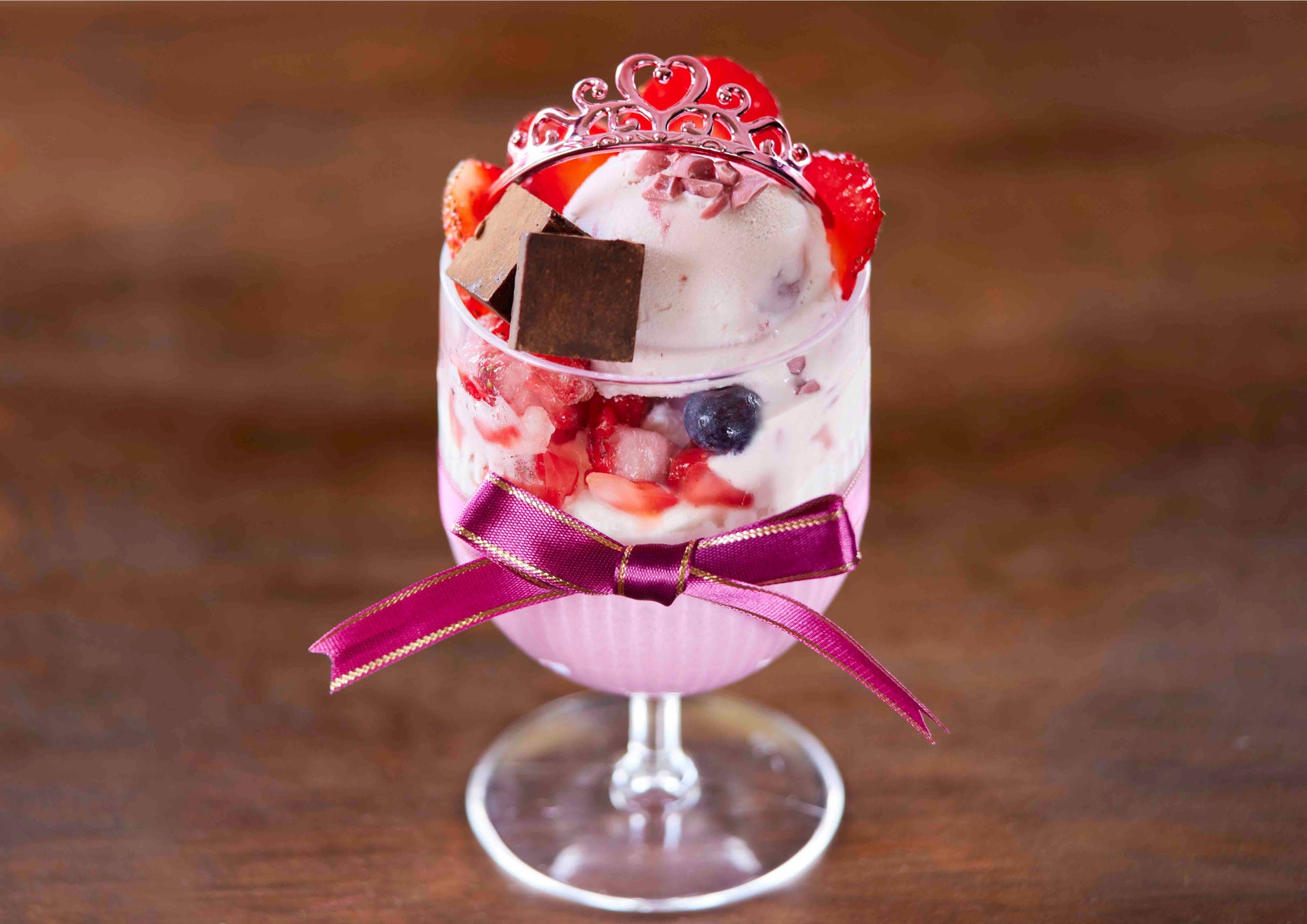 あっさりしたルビーチョコムースと甘酸っぱいベリーは相性抜群!見た目もキュートなパフェ。