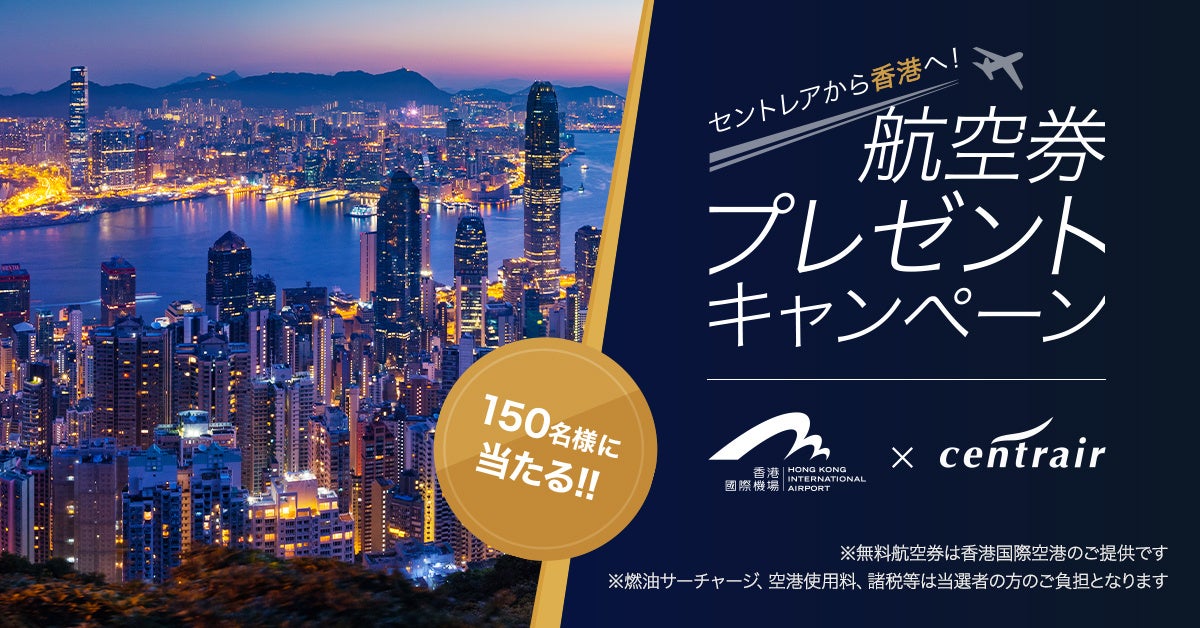 中部国際空港株式会社(所在:愛知県常滑市、代表:犬塚力)は、香港国際空港との連携企画として、セントレア=香港線で利用可能な無料往復航空券が抽選で150名様へ当たる「セントレアから香港へ!航空券プレゼントキャンペーン」を実施します。