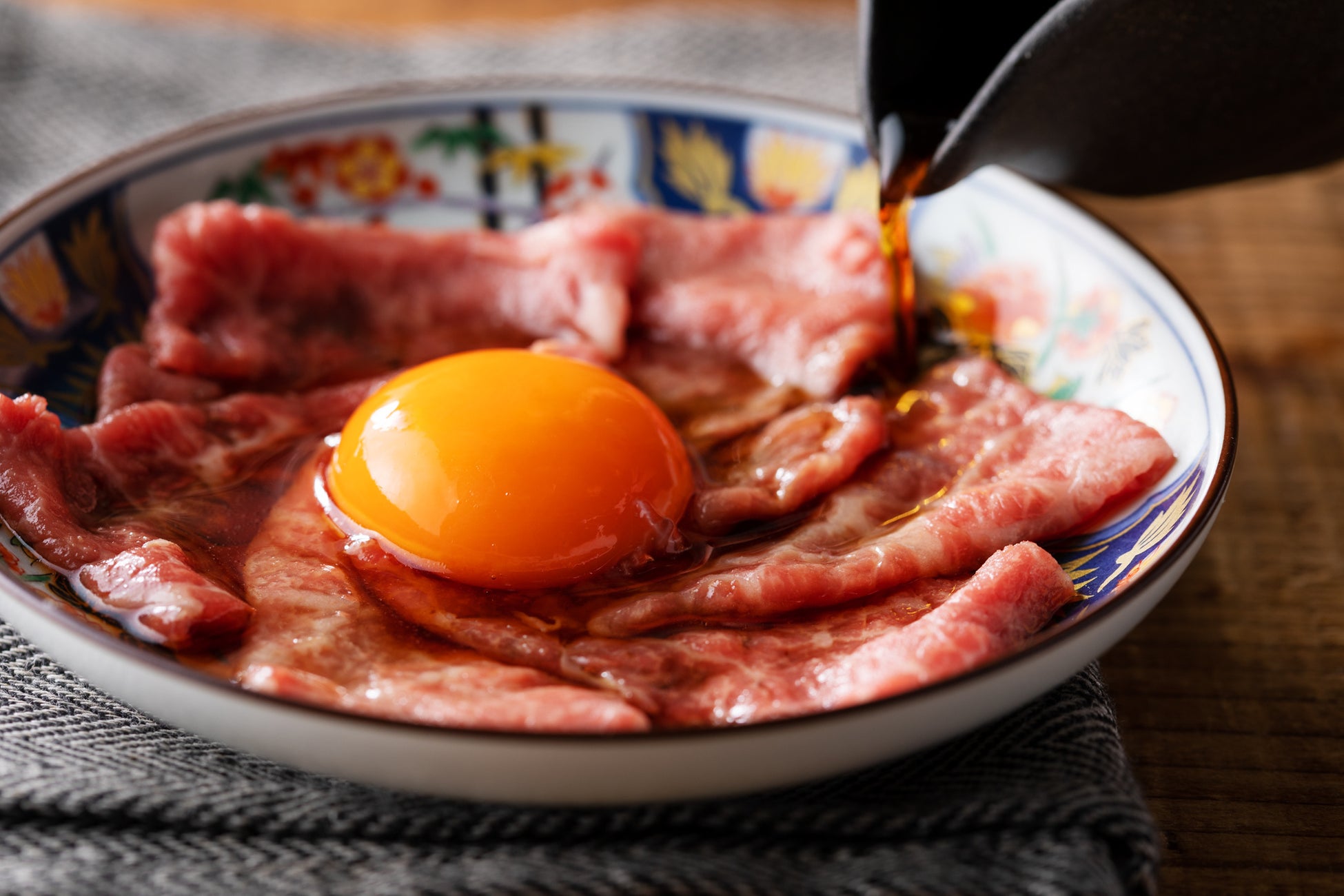 低温調理で火入れした黒毛和牛は、 絶妙な 卵は茨木県奥久慈のブランド卵を使用。鰹と昆布の温かい特製和出汁をかけてお召し上がりください。
