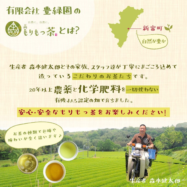 有限会社豊緑園の「もりもっ茶」は、宮崎県新富町にある有機JAS認定の畑で真心こめてつくられているこだわりのお茶です。豊かな自然と高い技術が融合した新たな茶の魅力を、ぜひご堪能ください。