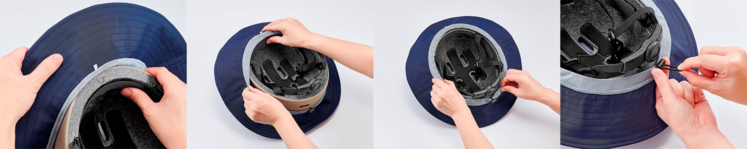 帽子を取り付けたら、ドローコードでしっかりと締めて、ヘルメットに固定する。