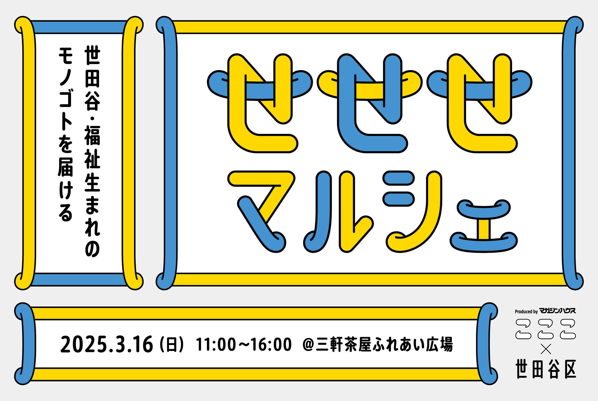 2025年3月16日、本プロジェクトの一環として、世田谷区三軒茶屋にある〈ふれあい広場〉にて「せせせマルシェ」を開催します。世田谷区内にある12の障害者施設が出店し、施設でつくるお菓子やパンなどの食品からオリジナル雑貨までユニークなプロダクトを販売。また、マガジンハウス〈こここ〉編集部による読書会イベントや喫茶コーナー出店も予定しています。ぜひご来場ください。
