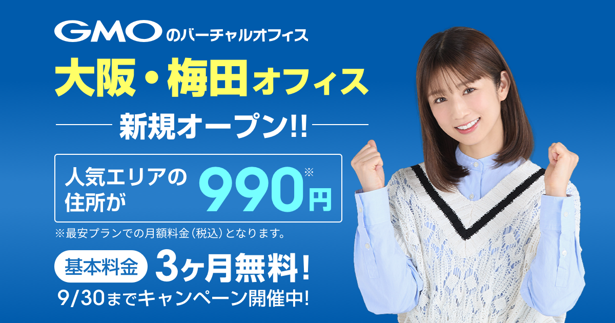 GMOインターネットグループのGMOフィナンシャルホールディングス株式会社の連結会社であるGMOオフィスサポート株式会社(代表取締役社長:松永 知也 以下:当社)は、オフィス住所を業界最安値水準の料金でレンタルできるバーチャルオフィスサービス「GMOオフィスサポート」(URL:https://www.gmo-office.com/)において、2022年9月15日(木)より、初進出となる大阪・梅田のオフィス住所の提供を開始いたします。
