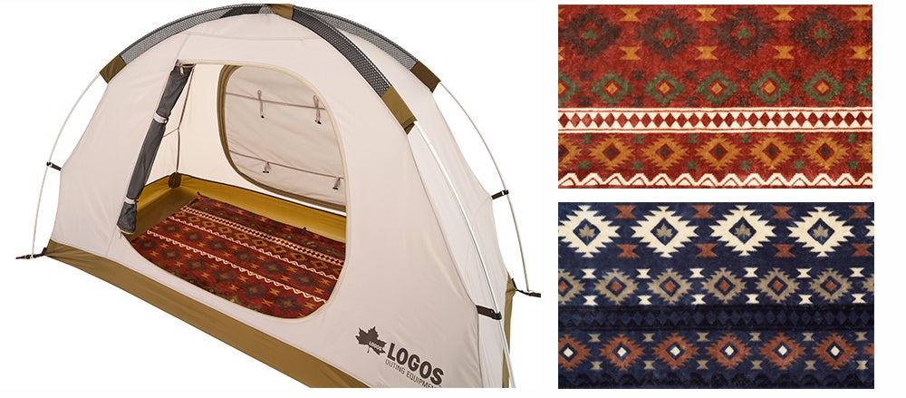 アウトドアシーンでは、インナーマットとして敷くと底冷えを軽減して快適に過ごすことができる。テントサイトのレイアウトやお家でのインテリアにも馴染みやすいLOGOSオリジナルのネイティブ柄デザイン。