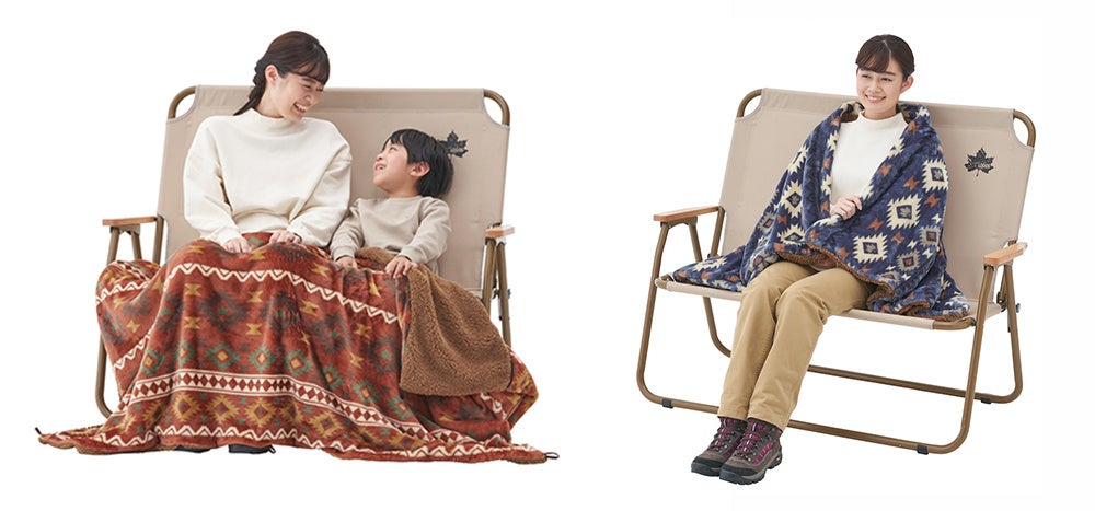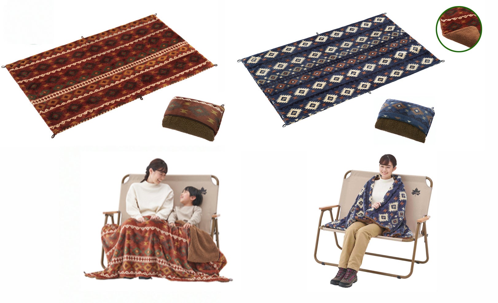 LOGOSオリジナルのネイティブ柄が特長で、これから迎える秋冬キャンプにぴったりなあたたかな色合いの2色を展開します。保温性も肌触りも抜群で、羽織りや膝掛けとして使用できて、100cm×150cmと大きめのサイズなので、並んで座れば親子で一緒に使うこともできます。ポケッタブル仕様なので、収納すればクッションに早変わりするほか、インナーマットとしてテント内に敷けば底冷えを軽減するので、快適に過ごすことができます。