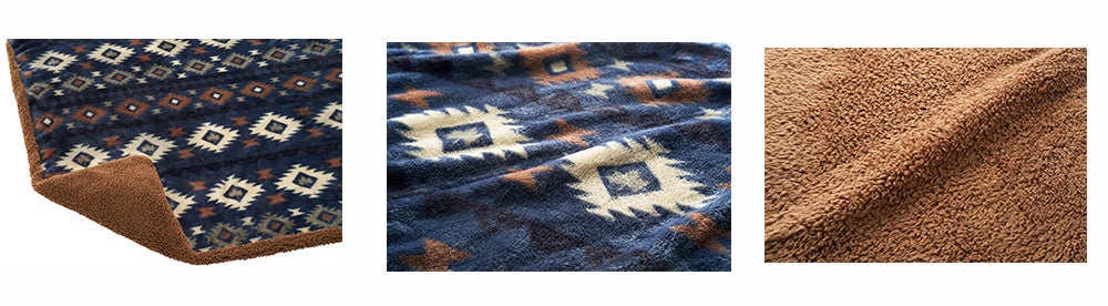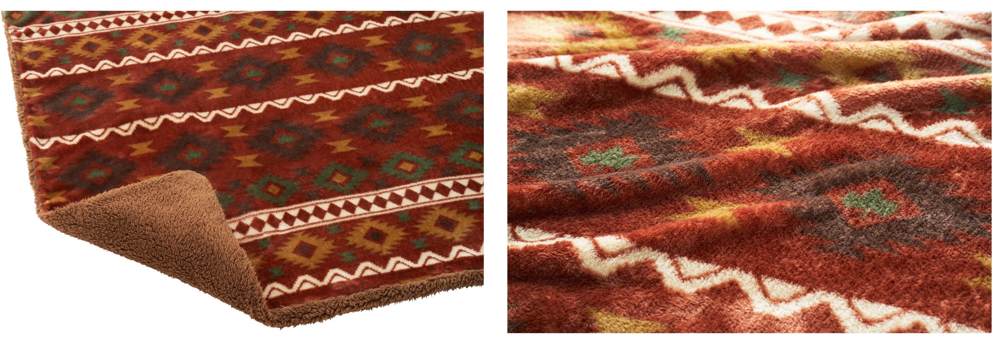 気分に合わせて使い分け可能なリバーシブルデザインのブランケットで、表はオリジナルデザインのフリース素材、裏はあたたかく肌触りの良いボア仕様になっており、フリース素材は繊維同士の間に空気の層が生まれるため、体から発する熱を逃さず冷たい外気を遮断することができるので、保温性に優れます。
