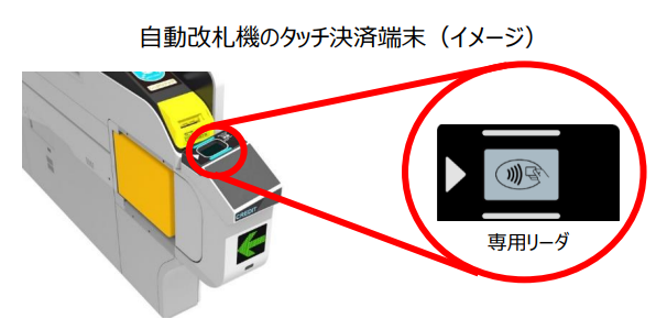 お手持ちのタッチ決済対応のカード(クレジット・デビット・プリペイド)や、同カードが設定されたスマートフォン等を、自動改札機に新たに設置する専用リーダ(※)にタッチすることで、そのまま改札を通過しご乗車いただけます。