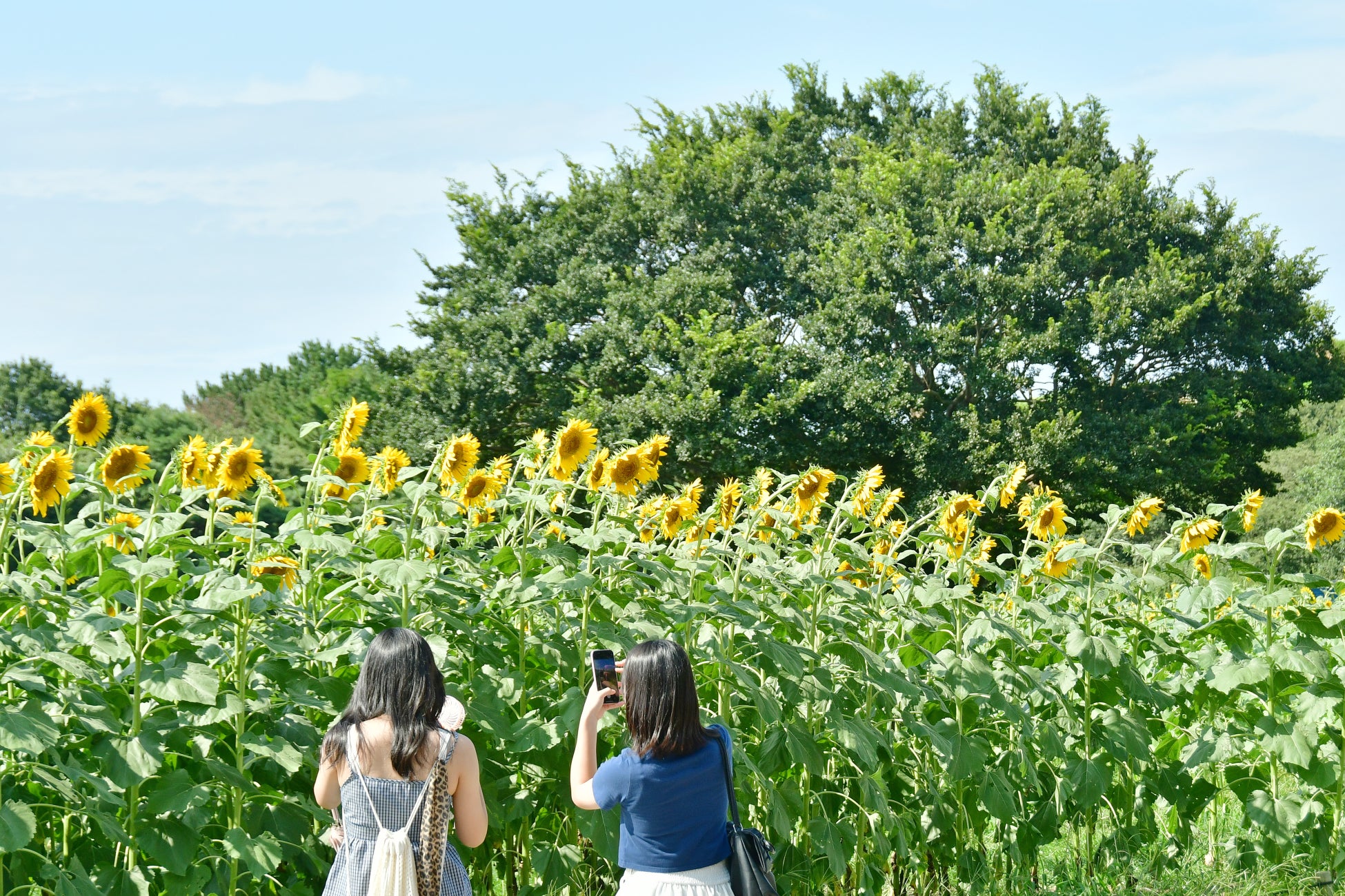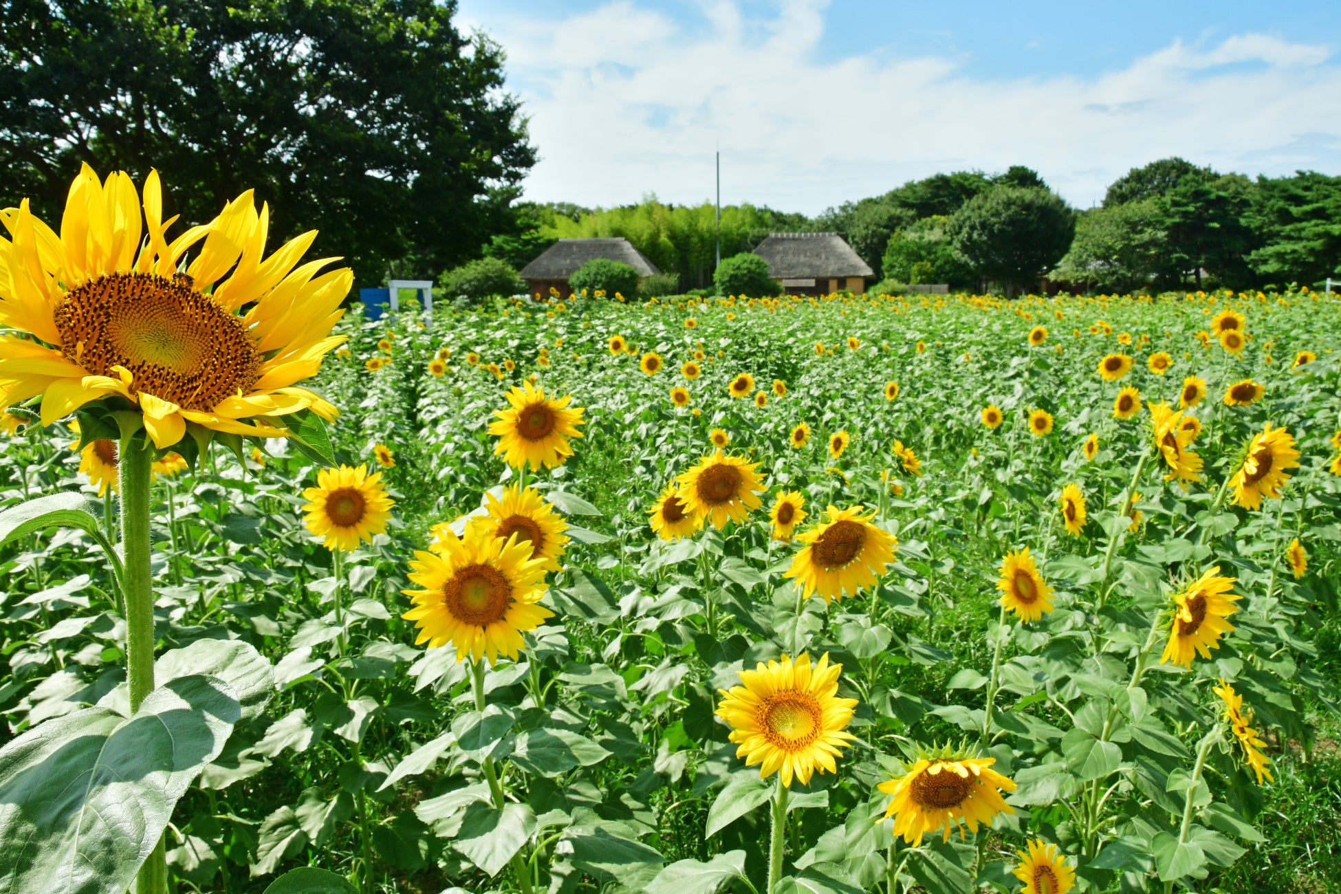 国営ひたち海浜公園の「みはらしの里」では、約2万本のヒマワリがもうまもなく見頃を迎えようとしております。8月1日頃から咲き始めたヒマワリは、9日頃に見頃を迎え15日頃までは比較的花数が多い状態で楽しめると予想しています。夏の代表的な花として人気が高く、真夏の太陽に向かって大きな花を咲かせる花姿が魅力のヒマワリ。花畑一面を覆い尽くす色鮮やかな黄色い花が、昔懐かしい古民家や広大なコキアの丘を背景に、夏空を彩る風景をお楽しみいただけます。