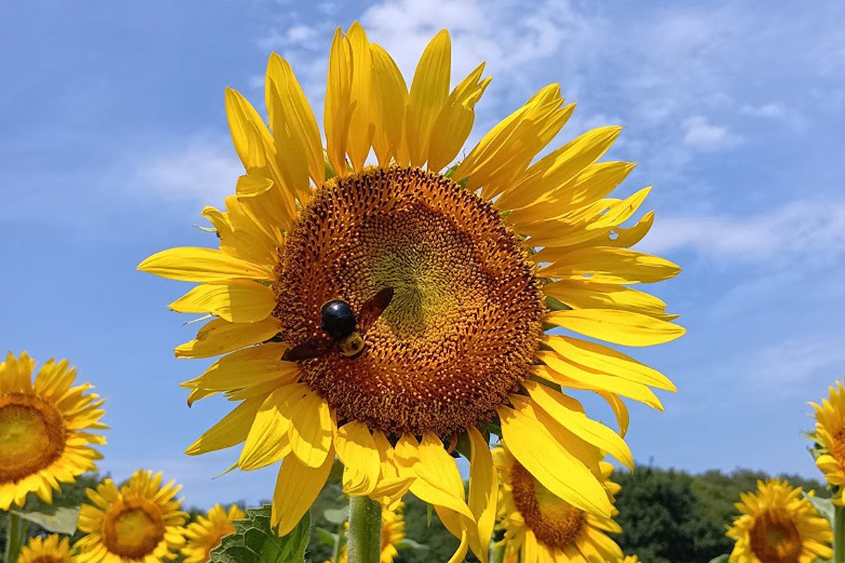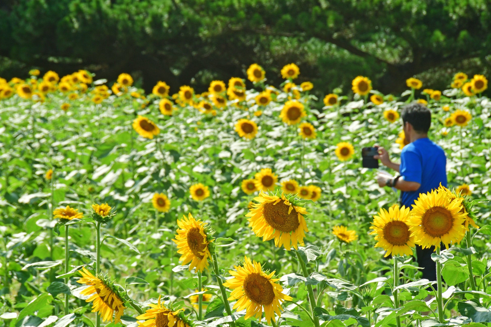 「みはらしの里」の花畑には散策路が設けられており、ヒマワリに囲まれたSNS映えする写真を撮ることができます。また、花畑内に設置されている「みはらし台」からは、黄色い絨毯のように広がるヒマワリを見下ろすことができ、古民家やジニア、コキアとの夏の共演も見どころです。他にも花畑内に青色の扉を設置しており、おすすめのフォトスポットとなっております。