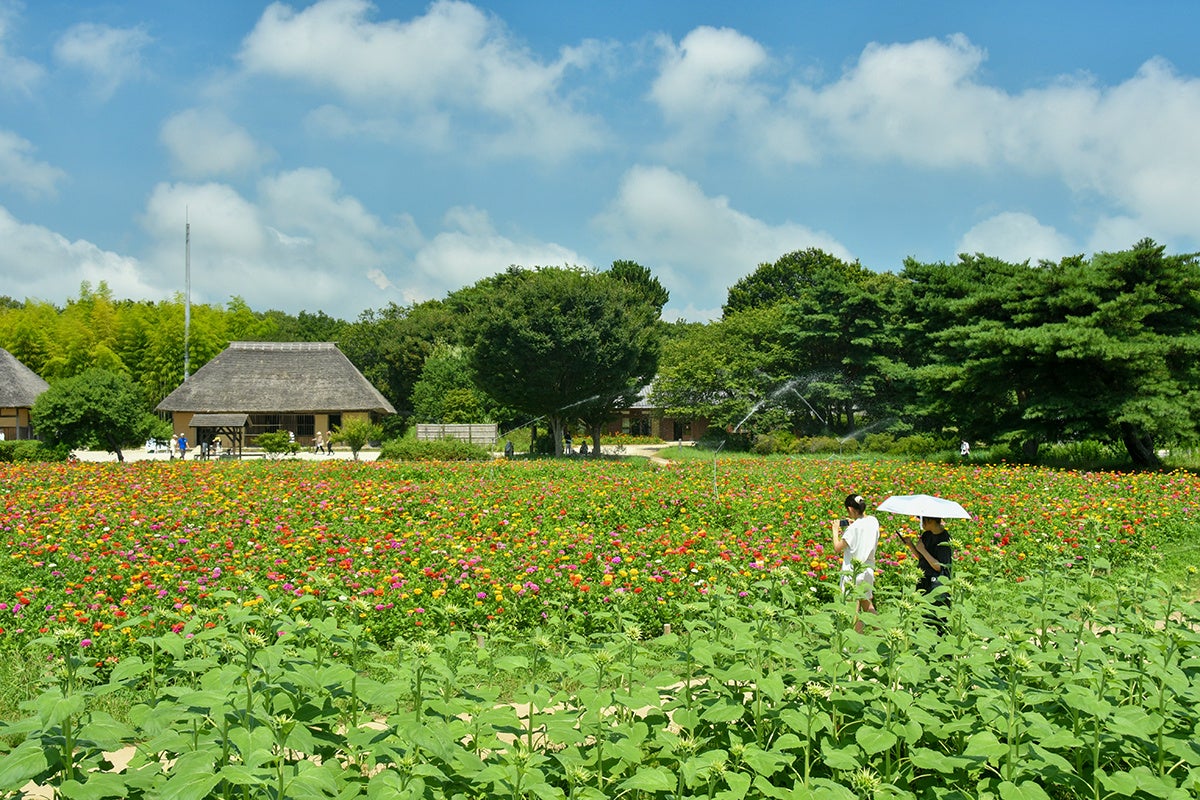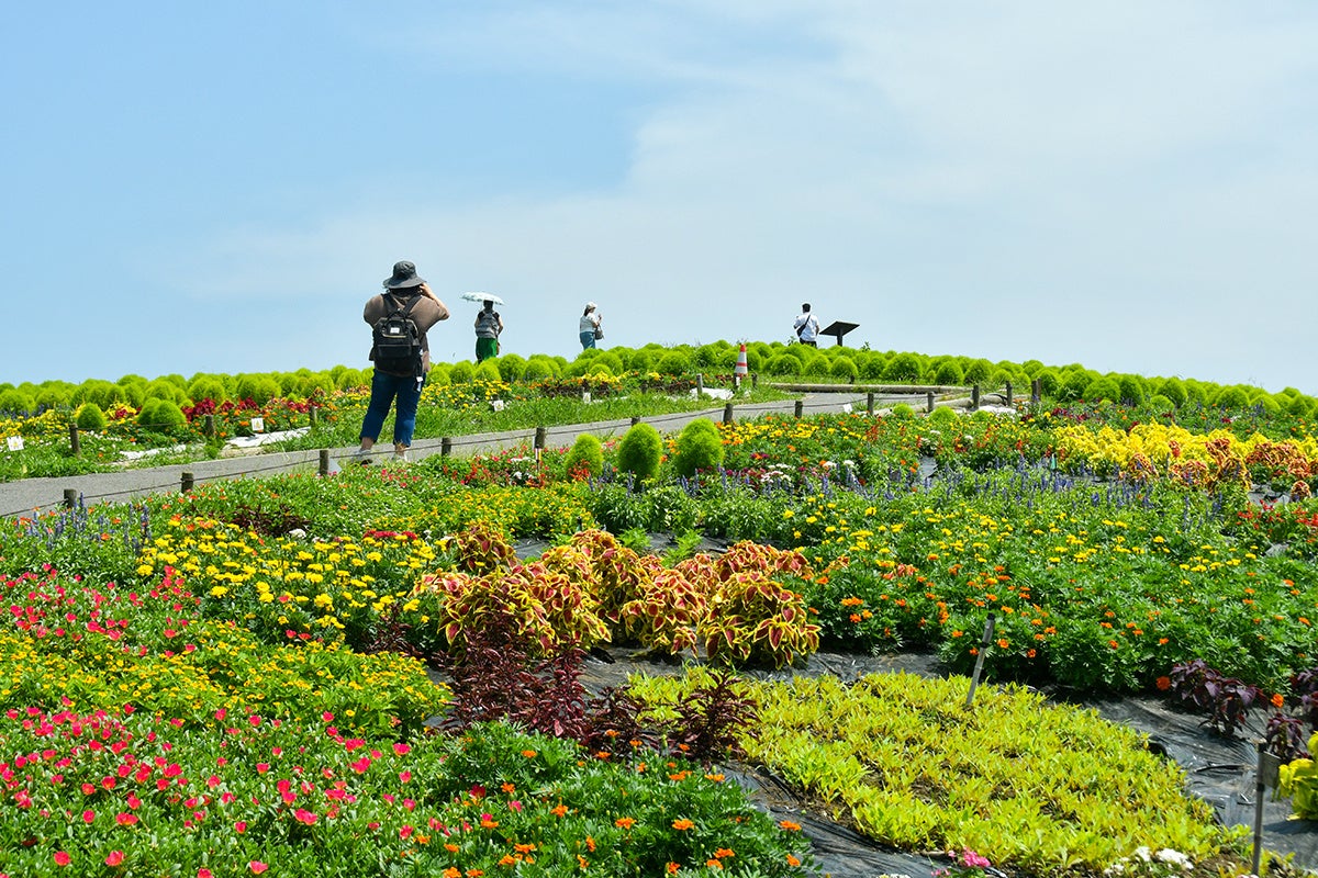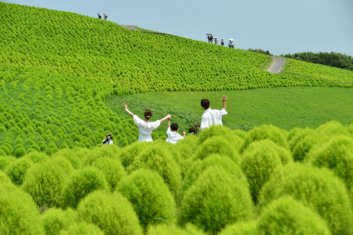 みはらしの丘では、爽やかなライムグリーンのコキアが成長中。現在は約50~60cmほどに育ち、今後は“ふわふわ”とした大きく丸い形状で約70cmまでに成長します。また、丘の第1頂上入口にある「ウェルカムガーデン」では、色とりどりの草花が来園者をお出迎え。夏空に映える、華やかで明るい景色が広がります。みはらしの里に植栽されているジニアも見頃を迎えており、8月25日頃までは比較的花数の多い状態でお楽しみいただけます。