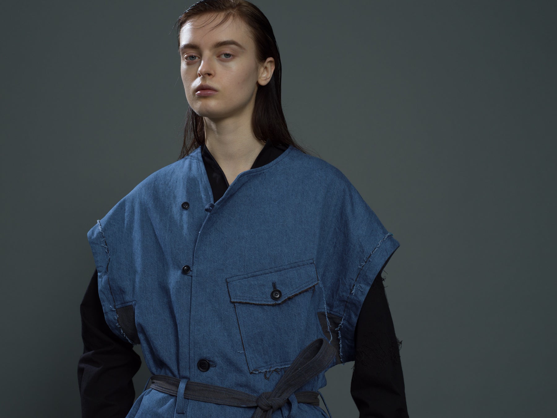 断ち切りで表現されたプリミティブで現代的な印象のデニムピース。表裏の色が違うデニムは、通常双方に出る色の影響が無いように織りが工夫され、断ち切られた生地の断面から色の違う糸が見えるデザインされた細部が、襤褸(ぼろ)のようなディテールを持つ原始的で粗野さのある印象の服に「デザイン性」という現代の要素を加える。