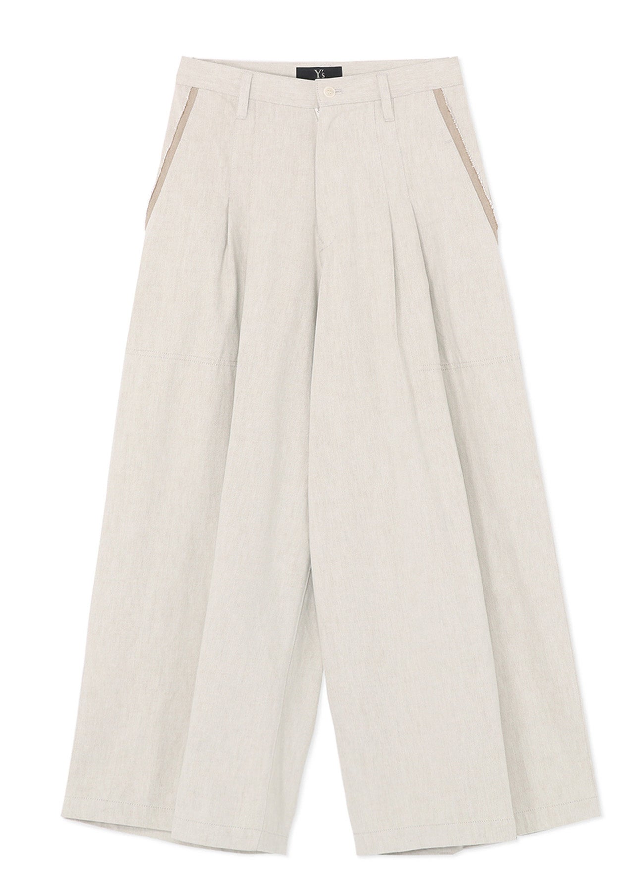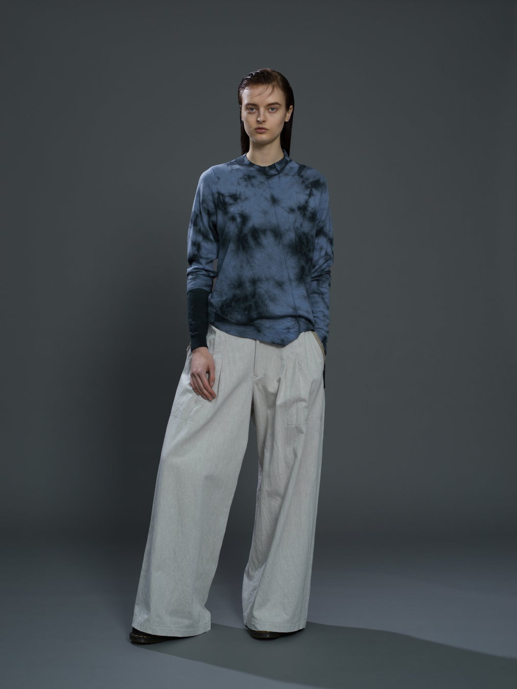 1枚の生地で表裏の色が違うデニムは、通常双方に出る色の影響が無いように織りが工夫され、断ち切られた生地の断面から色の違う糸が見えるデザインされた細部が、プリミティブな印象の服に「デザイン性」という現代の要素を加える。裏はベージュのホワイトデニムでつくられたワイドパンツ。