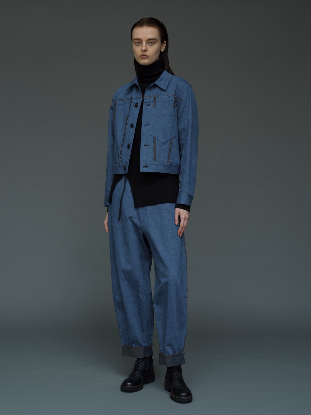 断ち切りで表現されたプリミティブで現代的な印象のデニムピース。表裏の色が違うデニムは、通常双方に出る色の影響が無いように織りが工夫され、断ち切られた生地の断面から色の違う糸が見える不思議なディテールを生む。ミニマムなセットアップのスタイルに断ち切りの表情や、生地の面白さがリズムを刻む。