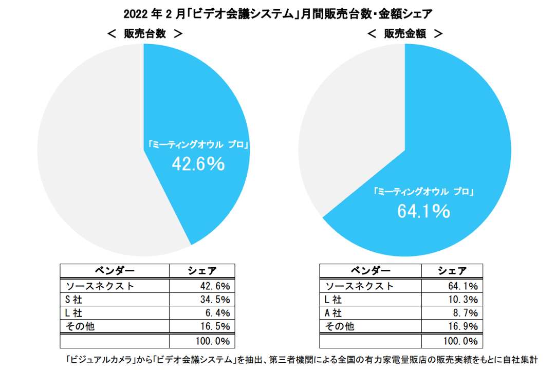 ソースネクスト株式会社(本社:東京都港区東新橋1-5-2 汐留シティセンター33階 代表取締役社長:小嶋 智彰)は、会議室用webカメラ「Meeting Owl Pro(ミーティングオウル プロ)」の2022年2月のビデオ会議システム市場でのシェアが、販売台数で42.6%(対前月比 4.0ポイント減)、販売金額で64.1%(対前月比 2.2ポイント減)となり、販売金額では2020年8月より19カ月連続でシェア第1位となりましたことをお知らせいたします。