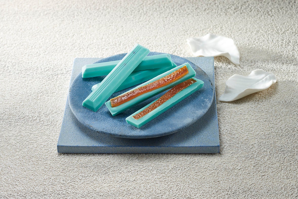 なめらかなベルギー産クーベルチュールを使用。カカオニブ入りとオレンジピールトッピングの2種が楽しめるスティックタイプのミントチョコレートです。
