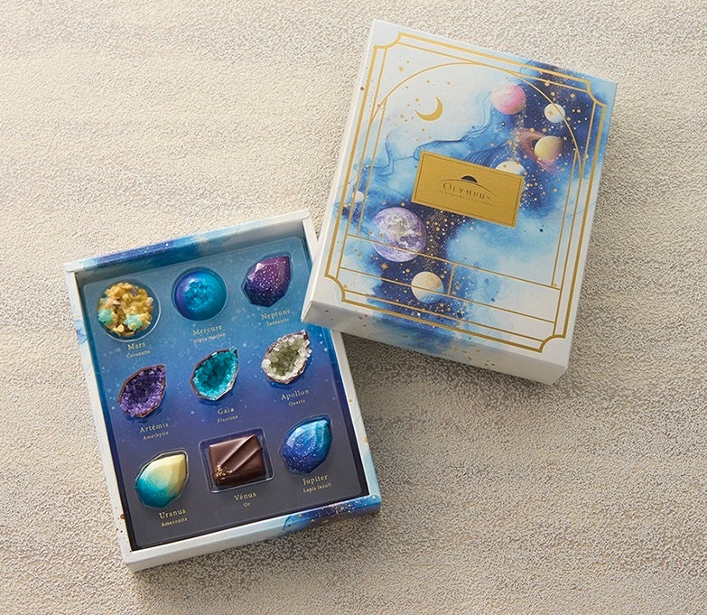 宇宙の彼方に思いを馳せて、惑星の結晶をイメージ。金平糖やザラメで宇宙鉱物の美しさを表現し、ずっと眺めていたくなる標本風のパッケージに仕上げました。