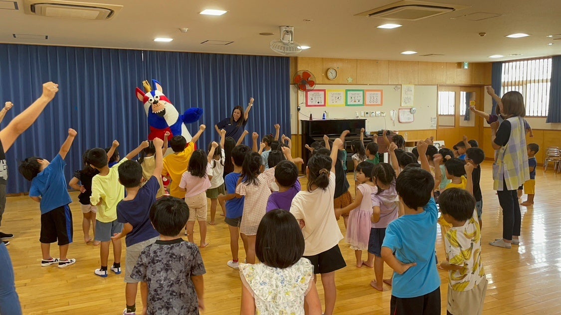 今回訪問した園では、キングスやゴーディーにまつわるクイズと、ストレッチやダンスを通して体を動かすことの楽しさを体験しながら、園児たちと交流を深めました。子どもたちは元気いっぱいにゴーディーの名前を呼びながら踊ったり、事前にキングスやゴーディーのことについて勉強していただいたり、ゴーディーのぬりえやキングスの展示をして迎えていただいたりと、楽しく交流することができました。