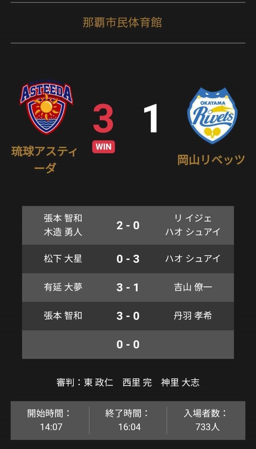 琉球アスティーダと岡山リベッツの試合は3-1で琉球アスティーダが勝利しました。