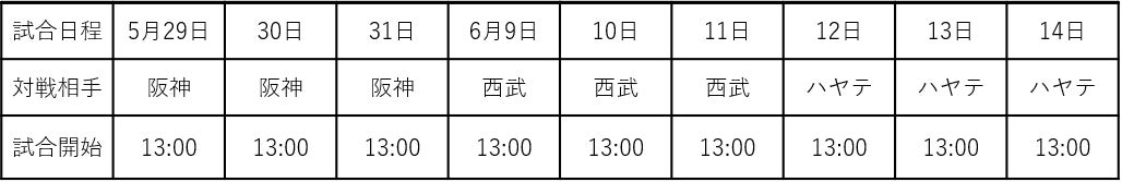 5月29日(金)~31日(日)の阪神戦は「伝統の一戦~The Classic Series~」として開催し、両球団OBによるトークショーや、全来場者へのオリジナルクリアファイル配布を行います。6月13日(土)・14日(日)のハヤテ戦は、CLUB 「CLUB GIANTSデー」として開催し、CLUB GIANTS会員先着600人にオリジナルTシャツを配布します。