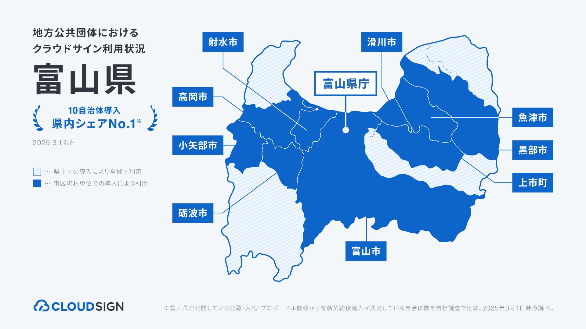 富山県では、クラウドサインを導入している自治体が10に達しました。これは県内自治体の62.5%に相当し、全国平均の20%を大きく上回る導入率となっています。